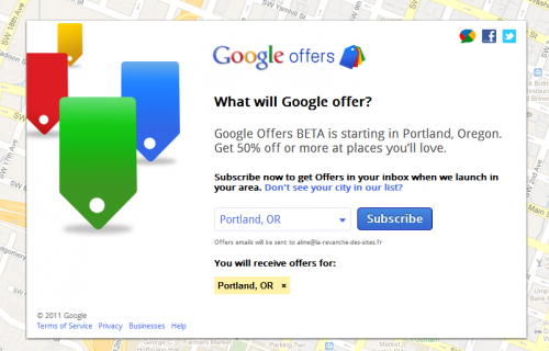 Google Offers n’est ni plus ni moins qu’un Groupon (NB: un site permettant de faire des achats groupés dans votre ville). Ici, il suffit de s’inscrire à la ville préférée et on reçoit ensuite par mail le deal du jour, tous les jours.