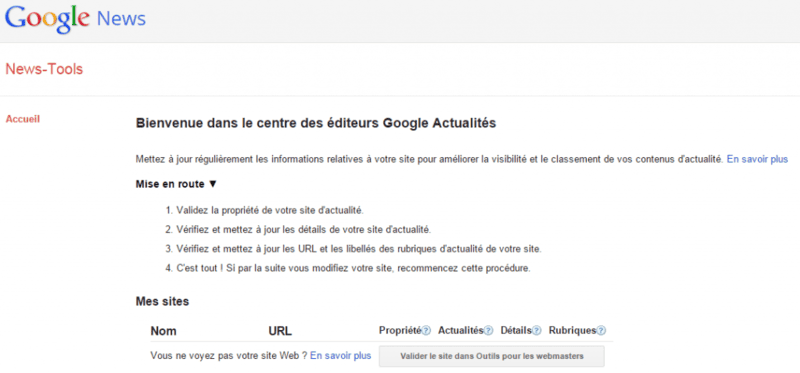 Pour pouvoir utiliser le centre il faut que votre site soit déjà présent dans Google Actualité. Il vous suffira ensuite de vérifier la propriété de votre site web depuis les outils Google pour les Webmasters.